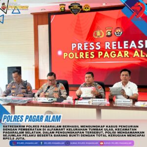 Pagaralam, BeritaTKP.com – Satreskrim Polres Pagaralam berhasil mengungkap kasus pencurian dengan pemberatan di Alfamart Kelurahan Tumbak Ulas, Kecamatan Pagaralam Selatan. Dalam pengungkapan tersebut, polisi mengamankan sejumlah pelaku beserta barang bukti dengan total kerugian mencapai Rp93,8 juta.