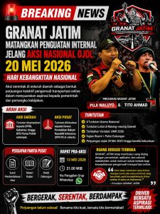Surabaya, BeritaTKP.com – Gerakan Rakyat Transportasi Online Jawa Timur (GRANAT JATIM) terus memantapkan konsolidasi internal menjelang aksi nasional pengemudi ojek online yang dijadwalkan berlangsung serentak pada 20 Mei 2026, bertepatan dengan peringatan Hari Kebangkitan Nasional (27/4).