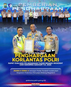 SURABAYA, BeritaTKP.com – Polda Jawa Timur (Jatim) kembali menorehkan prestasi membanggakan dengan meraih penghargaan dari Korps Lalu Lintas (Korlantas) Polri. Penghargaan ini bukan sekadar simbol, tetapi pengakuan atas kerja keras, inovasi, dan dedikasi seluruh jajaran Ditlantas Polda Jatim dalam meningkatkan pelayanan serta keamanan lalu lintas di wilayah Jawa Timur.