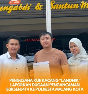 MALAMG KOTA BeritaTKP.com – Seorang pengusaha kue kacang asal Kota Malang, Joshua Travin, melalui kuasa hukumnya Legar Reza, S.H., resmi melayangkan pengaduan kepada Kapolresta Malang Kota atas dugaan tindak pidana pengancaman dengan sajam yang dilakukan oleh seorang pria berinisial AD