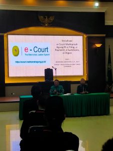 Usai acara pelantikan, kegiatan dilanjutkan dengan sosialisasi e-Court Mahkamah Agung RI yang membahas layanan peradilan elektronik meliputi e-Filing, e-Payment, e-Summons, dan e-Litigasi.