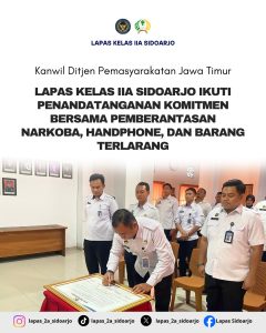 Sidoarjo, BeritaTKP.com — Lembaga Pemasyarakatan Kelas IIA Sidoarjo mengikuti kegiatan Penandatanganan Komitmen Bersama Jajaran Pemasyarakatan dalam Memberantas Narkoba, Handphone, dan Barang Terlarang di lingkungan Lapas, Rutan, LPKA, dan Bapas seluruh Indonesia. Kegiatan ini dilaksanakan secara virtual melalui aplikasi Zoom Meeting dan diikuti serentak oleh seluruh jajaran pemasyarakatan di tanah air.