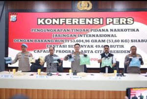 RIAU, BeritaTKP.com – Polda Riau berhasil mengungkap jaringan peredaran narkoba antarprovinsi dalam operasi yang dilakukan pada 9 Januari 2025. Empat tersangka ditangkap dan barang bukti berupa 53,60 kilogram sabu dan 49.682 butir ekstasi berhasil disita.