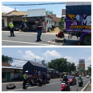 Malang,BeritaTKP.com – Senin, 13 Oktober 2025, pukul 10.45 WIB, anggota Polsek Dau Malang yang dipimpin oleh Pawas Ipda Heru Wahono, S.H., bersama dua anggota lainnya, Aiptu Bambang dan Aipda Aji H., melakukan aksi cepat tanggap dalam membantu pengamanan arus lalu lintas di Jalan Raya Mulyoagung No. 259 A, Desa Mulyoagung, Kecamatan Dau, Kabupaten Malang. Truk S-9372-WM yang mengangkut makanan ternak kucing mengalami ban meletus saat melintas di lokasi tersebut, sehingga menyebabkan potensi kemacetan.