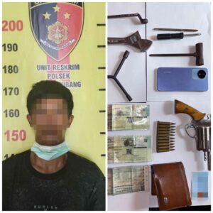 1 pucuk senjata api rakitan jenis revolver dengan amunisi senpi laras panjang jenis SS1 kaliber 5.56,10 butir amunisi kaliber 5.56, 1 (satu) buah kunci T, 1 (satu) buah kunci Y, 1 (satu) buah kunci L, 1 (satu) buah obeng genggam hitam, 1 (satu) buah mata obeng, 1 (satu) buah kunci 12 – 13, 1 (satu) buah kunci inggris, 1 (satu) buah KTP, 1 (satu) buah dompet, 3 (tiga) buah STNK, 1 (satu) buat tas berwarna hitam, 1 (satu) buah Handphone OPPO Y0Y0