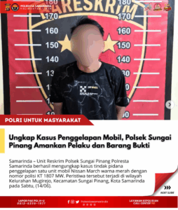 Samarinda, BeritaTKP.com – Unit Reskrim Polsek Sungai Pinang Polresta Samarinda berhasil mengungkap kasus tindak pidana penggelapan satu unit mobil Nissan March warna merah dengan nomor polisi KT 1807 MW. Peristiwa tersebut terjadi di wilayah Kelurahan Mugirejo, Kecamatan Sungai Pinang, Kota Samarinda pada Sabtu, (14/06).