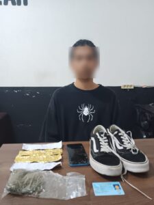 Dari hasil penggeledahan, tim menemukan 1 bungkus narkotika jenis ganja dengan berat bruto 20 gram, yang disembunyikan dibawah Telapak Sepatu Sebelah Kiri dan 1 unit handphone merk Redmi 10 warna biru.